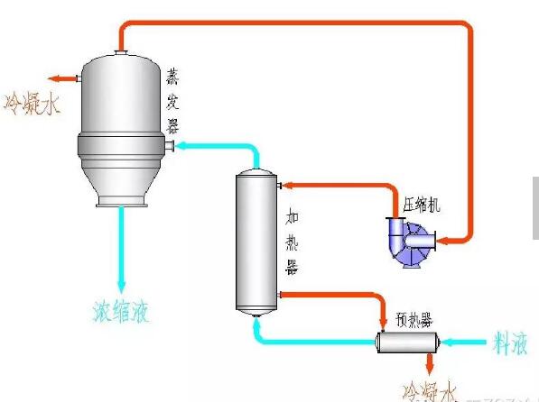 MVR蒸發(fā)器其工作過程是低溫位的蒸汽經(jīng)壓縮機(jī)壓縮,溫度、壓力提高,熱焓增加,然后進(jìn)入換熱器冷凝,以充分利用蒸汽的潛熱。除開車啟動外,整個(gè)蒸發(fā)過程中無需生蒸汽。除開車啟動外,整個(gè)蒸發(fā)過程中無需生蒸汽從蒸發(fā)器出來的二次蒸汽,經(jīng)壓縮機(jī)壓縮,壓力、溫度升高,熱焓增加,然后送到蒸發(fā)器的加熱室當(dāng)作加熱蒸汽使用,使料液維持沸騰狀態(tài),而加熱蒸汽本身則冷凝成水。這樣原來要廢棄的蒸汽就得到充分的利用,回收潛熱,提高熱效率,生蒸汽的經(jīng)濟(jì)性相當(dāng)于多效蒸發(fā)的30效。其中為使蒸發(fā)裝置的制造盡可能簡單和操作方便,可使用離心式壓縮機(jī)、羅茨式壓縮機(jī)。這些機(jī)器在1:1.2到1:2壓縮比范圍內(nèi)其體積流量較高。