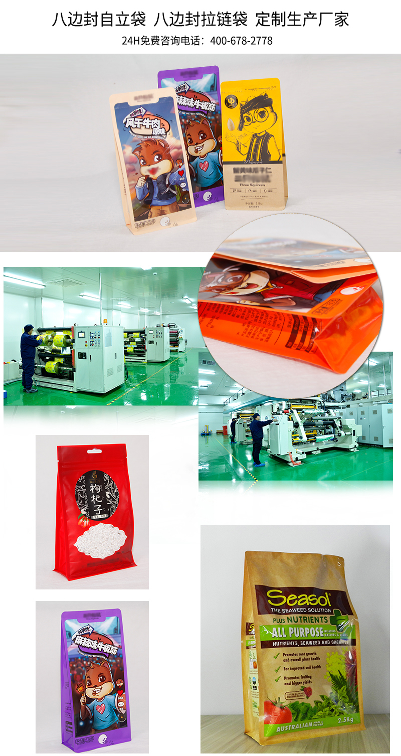 袋型優勢:八邊封食品包裝即底部四條封邊,(工藝不同底部有時可能兩條封邊)兩側各兩條封邊,能夠獨立站立,內部空間大,并且雙側邊參與印刷圖案,整體感良好,部分包裝還會采用配合拉鏈口作為開口方式,達到可循環使用的目的。